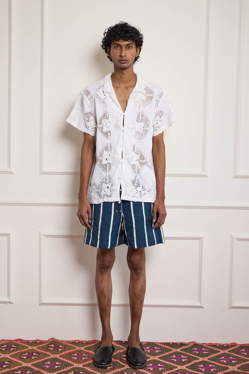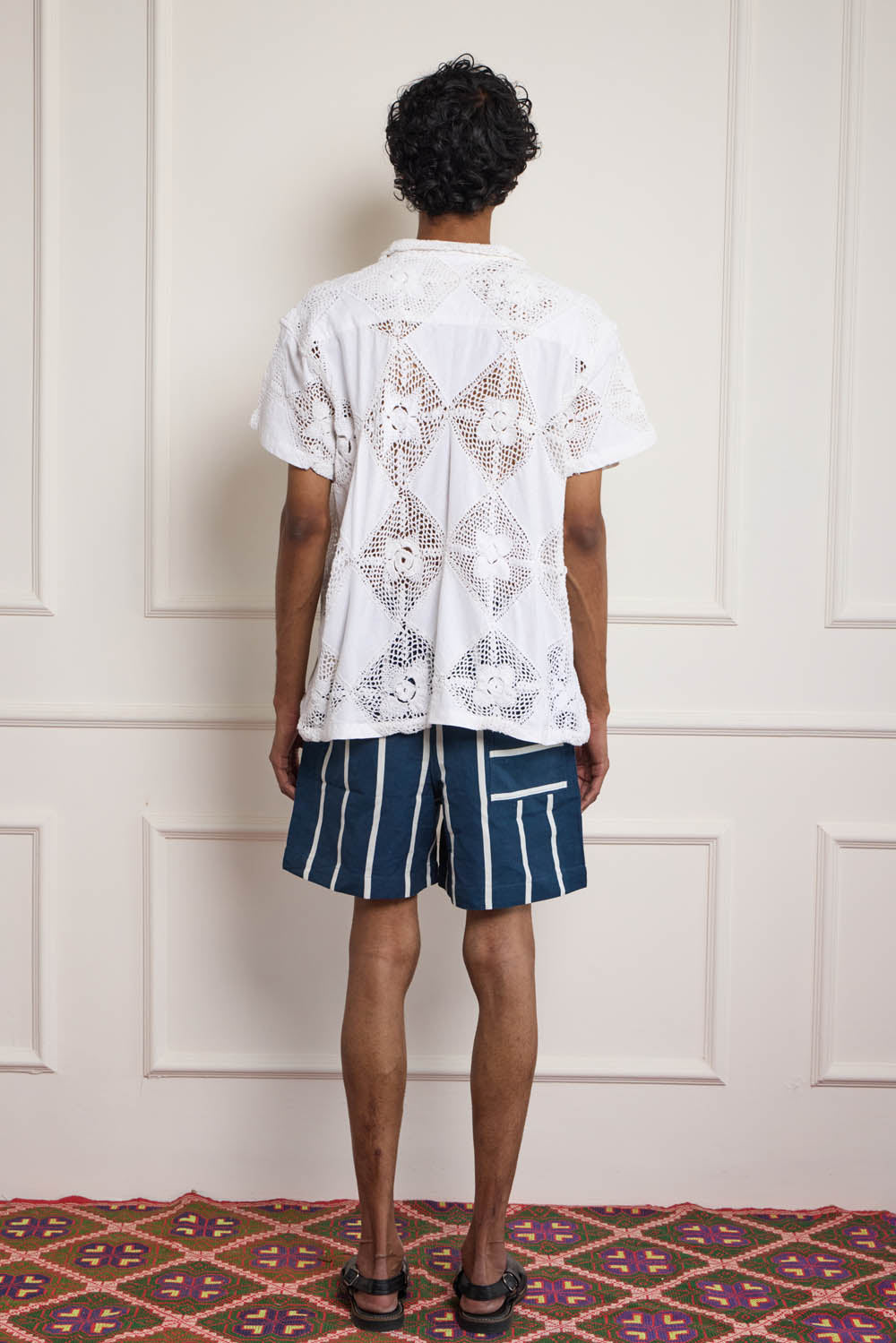 Inspired by a vintage bedcover found in the designer’s mother’s textile trunk, this shirt is crafted in crochet patchwork for a nostalgic yet playful feel. With its airy texture and artisanal charm, it’s the perfect piece for holiday dressing and carefree beach days.