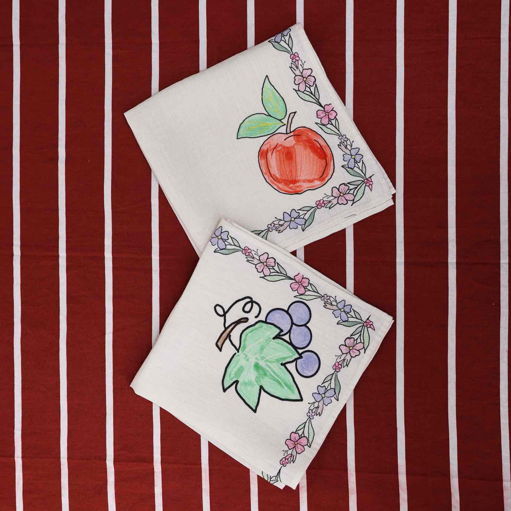 These screen print table napkins are inspired by children’s drawings and coloring books, showcasing fruits in their authentic, raw, and innocent nature. The playful, unrefined style captures the true essence of each fruit, bringing a fresh and heartwarming touch to your dining table, perfect for adding a fun, nostalgic charm.
