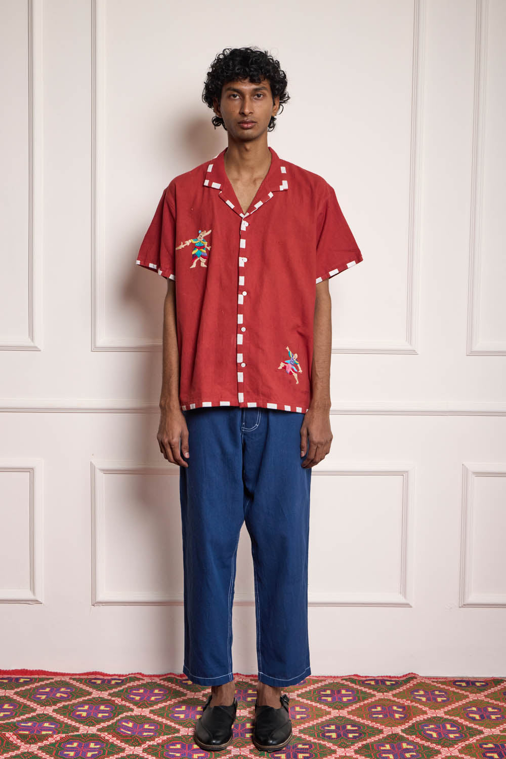 This shirt is made from natural dyed red hand spun and handwoven cotton fabric and then decorated with Parsi embroidery inspired motifs.