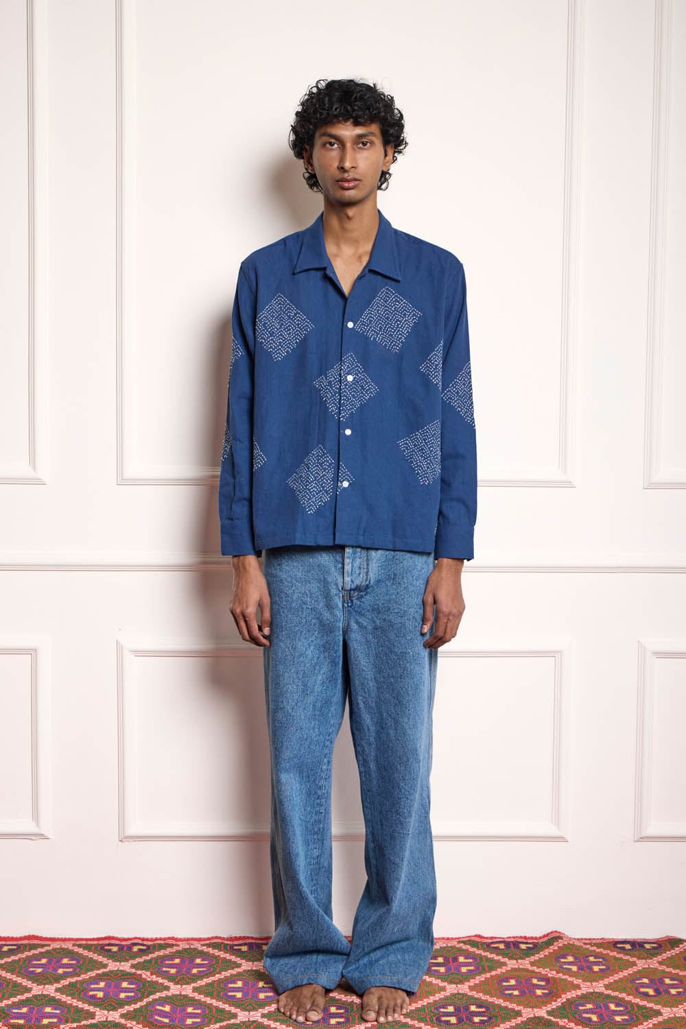 This shirt is made from hand spun and handwoven indigo fabric. The yarns were dyed with natural fermented indigo. The shirt was later finished with kantha embroidery details on it.