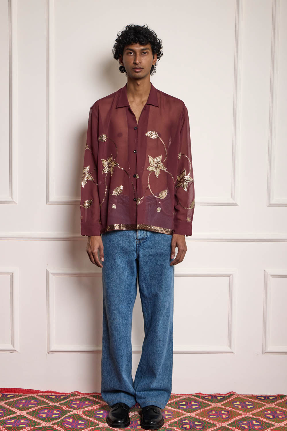 This shirt has been made from a silk fabric and then decorated with golden sequins over it.